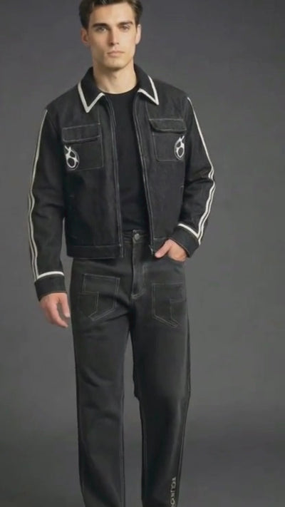 The Black Contrast Stripe Denim Jacket is where athletic edge meets elevated streetwear. Crafted in premium washed black denim, the jacket features bold white contrast stripes running down both sleeves, crisp white piping on the collar and cuffs, and signature Fouroz icon embroidery on the chest pockets.
