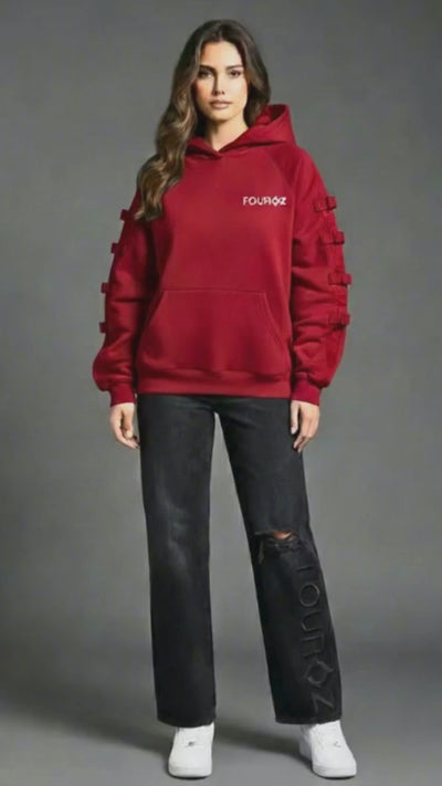The Red Oversized Utility Hoodie brings effortless comfort and modern streetwear detailing together in one signature Fouroz silhouette. Crafted from premium heavyweight fleece, it features a deep crimson tone paired with signature sleeve buckle straps for an elevated, utility-inspired look.